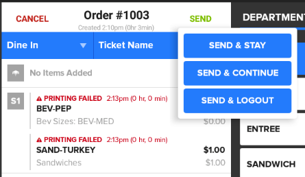 - Send & Continue - Sends Ticket and Exits to Ticket Grid view. This is the current default behavior of the SEND button in the POS.