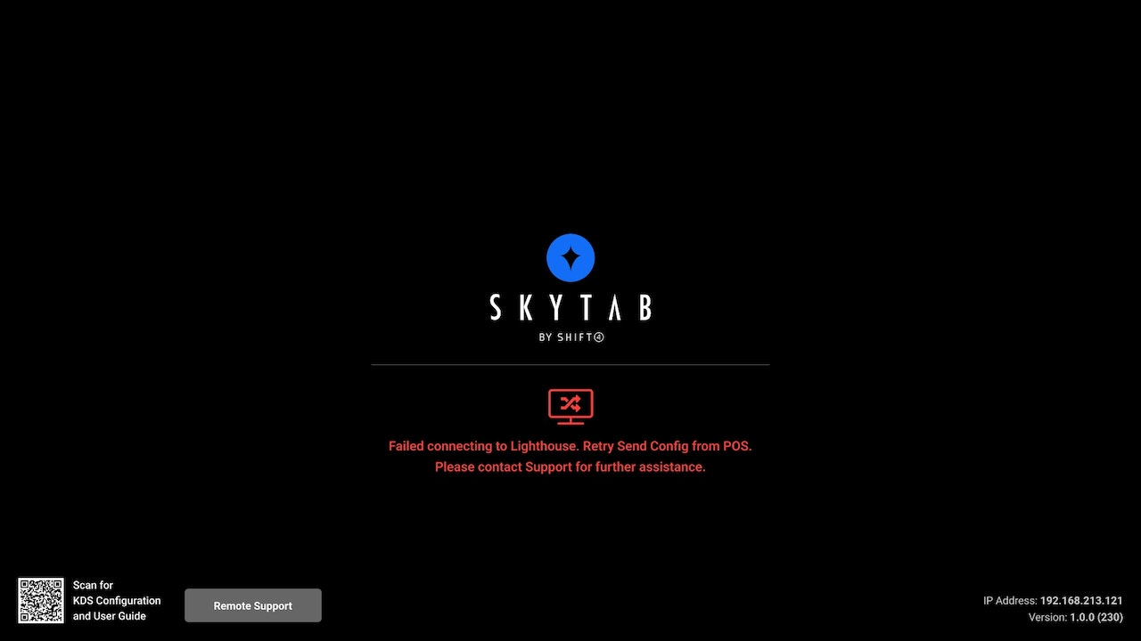 If you are unable to resolve this issue or need help, tap the Remote Support button on your KDS screen, located in the bottom left portion of the screen.