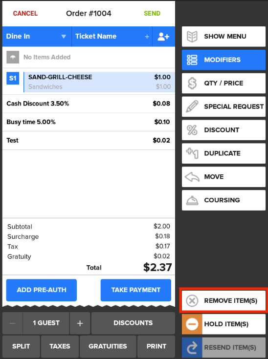 You will be returned to the Order Entry screen, with the selected item removed from your ticket.