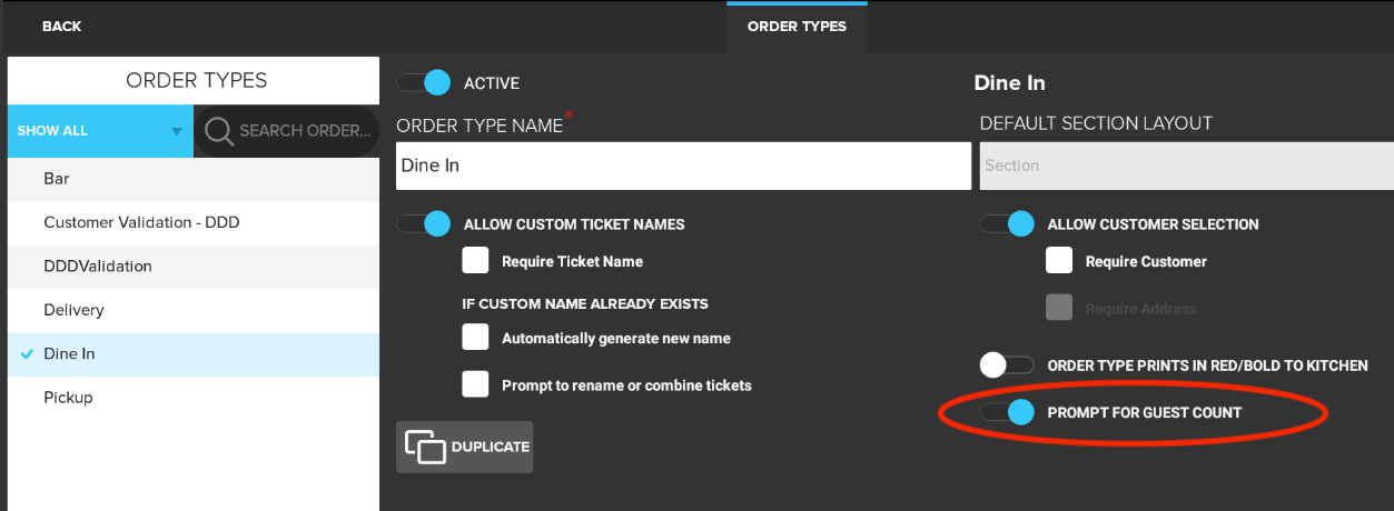 El Prompt for Guest Count Setting simplifica el proceso de asegurarse de que un recuento de invitados se introduzca para ciertos tipos de pedidos.
